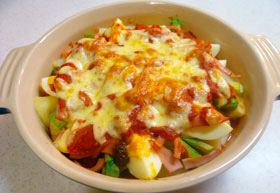 5.耐熱容器にバターを塗り、4を半分入れ、ジャガイモ、アスパラガス、卵、ハムを並べ、その上に残りの4をのせ、チーズをのせる。